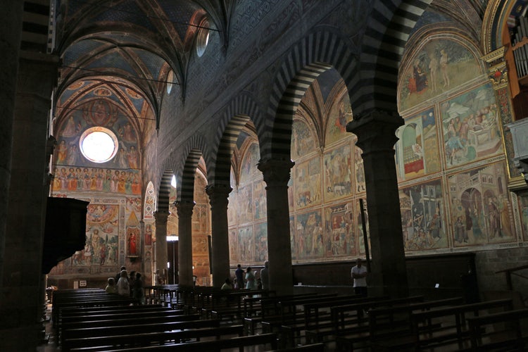 Chi arriva a San Gimignano dopo essere passato da Firenze , Pisa o Siena, resta certamente meno colpito dall’aspetto esteriore del Duomo. La semplicità della facciata romanica del XII secolo, difatti, non anticipa le meraviglie dell’interno. Divisa in tre navate, la Collegiata di Santa Maria Assunta conserva sulle pareti alcuni capolavori. Sulla parte superiore della controfacciata c’è il Martirio di San Sebastiano di Benozzo Gozzoli mentre nella parte centrale lo straordinario Giudizio Universale di Taddeo di Bartolo. Lungo la parete di destra si trovano le Storie del Nuovo Testamento, degli allievi di Simone Martini, e sulla sinistra Storie del Vecchio Testamentodi Bartolo di Fredi.